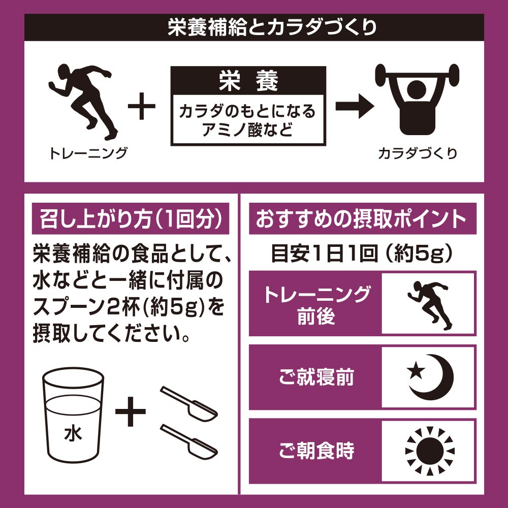 ①栄養補給の食品として、水などと一緒に付属のスプーン2杯(約5g)を摂取してください。