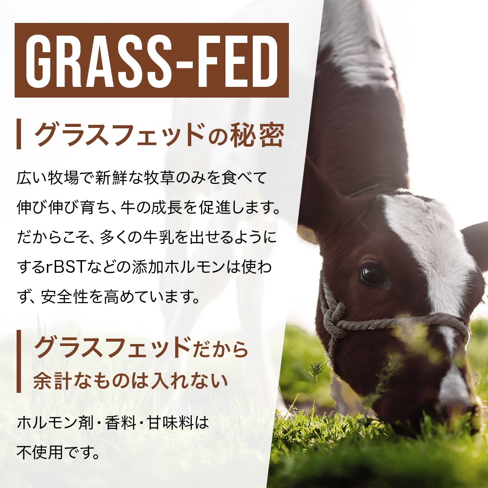 グラスフェッドホエイプロテインを使用。 グラスフェッドとは、広大な敷地で良質な牧草由来の飼料のみで飼育する方法を指します。 グラスフェッド牛は人工ホルモンを使用されず、ストレスフリーに育ちます。 毎日飲むプロテインだからこそ、成分に徹底的にこだわりました。